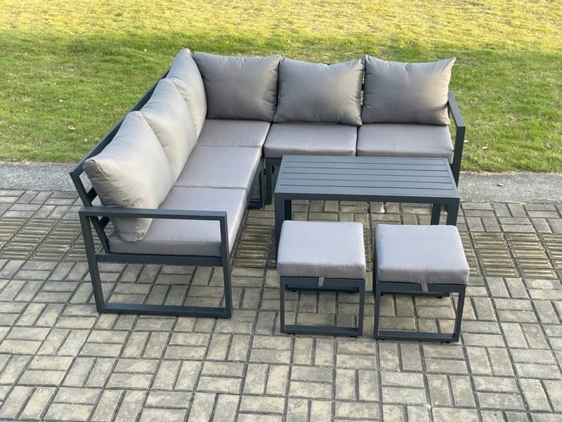 Create a refined outdoor seating area with this 7 seater deluxe garden furniture set, designed to bring structure and comfort to patios, decks, backyards, porches and poolside spaces. Made with an alloy aluminium construction, it is built for sturdiness and long-lasting use, and can be left outdoors all year round.