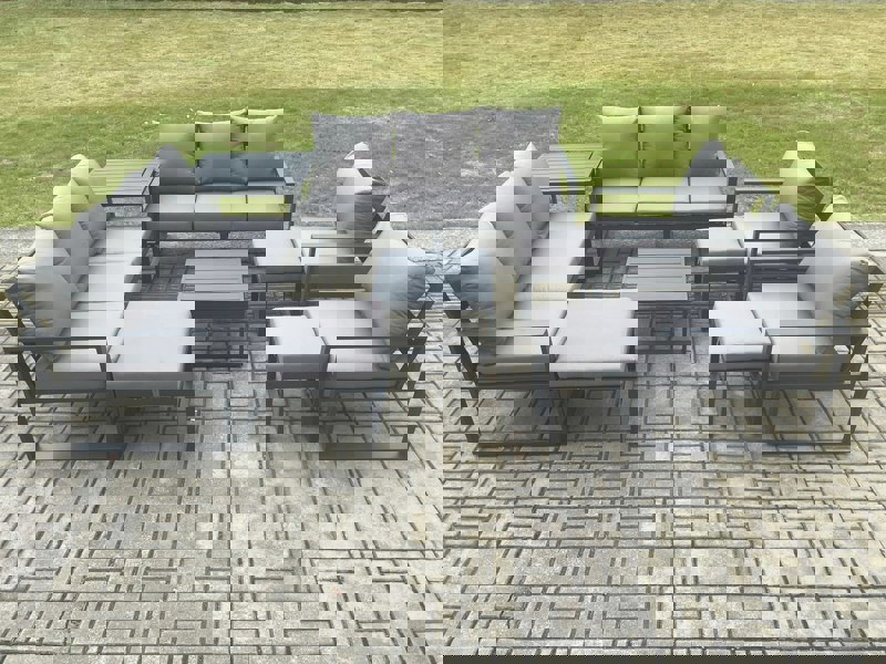 This 9-piece deluxe aluminium outdoor sofa set is designed to bring comfortable, coordinated seating to your patio or garden. Finished in dark grey powder coating with matching dark grey fabric, it offers a considered layout for relaxing and entertaining outdoors.