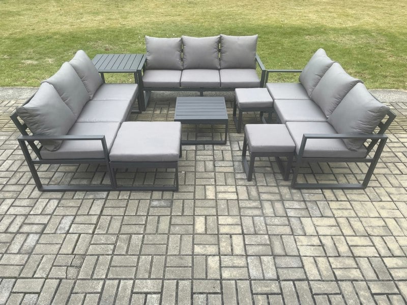 Crafted with an alloy aluminium construction for sturdiness and long-lasting use, this deluxe set is finished in dark grey powder coating with dark grey fabric. The aluminium table top is supplied without glass, while thick seat cushions and soft pillow back cushions add comfort for extended gatherings.