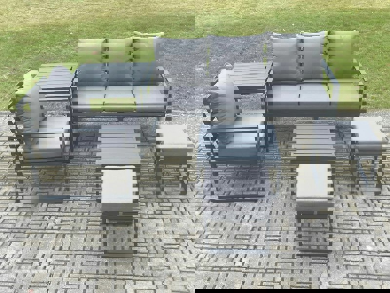 Designed for patios and gardens, this 6 seater deluxe outdoor sofa set brings a coordinated seating area to your space, complete with a square coffee table, a side coffee table and two footstools. Made from alloy aluminium with a powder-coated finish, it is created for sturdy, durable everyday outdoor use.