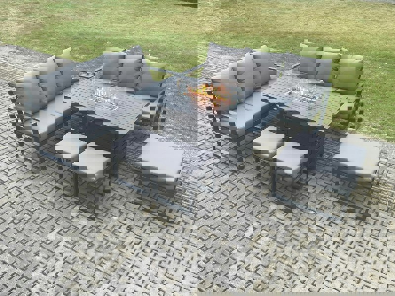The set includes a PC dining table with an integrated gas fire pit, alongside sofas, stools and a footstool for flexible hosting. With an alloy aluminium frame and powder coating to help prevent rust, it is made for outdoor use, while removable cushion covers support simpler day-to-day upkeep.