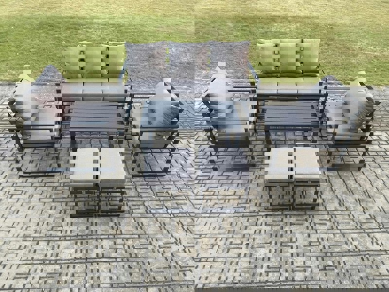 Create a refined outdoor seating area with this aluminium patio furniture set, designed for relaxed entertaining on the patio or in the garden. Finished in dark grey powder coating with dark grey fabric, it offers a coordinated look across the sofa, armchairs, stools and oblong coffee table.