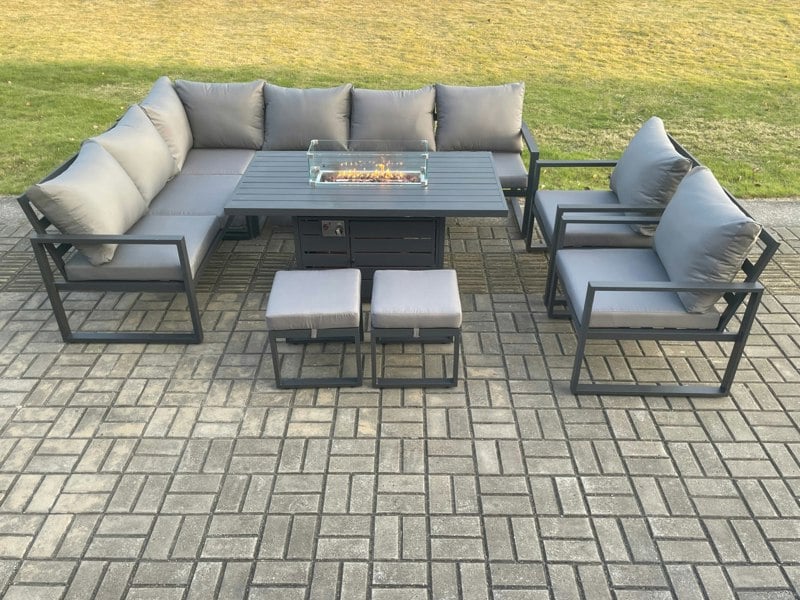 Designed for relaxed entertaining, this outdoor garden furniture set pairs a gas fire pit dining table with coordinated seating for a refined patio, balcony, or indoor space. The aluminium frame construction is built for sturdiness and long-lasting use, while the dark grey powder-coated finish and matching dark grey fabric create a clean, contemporary look.