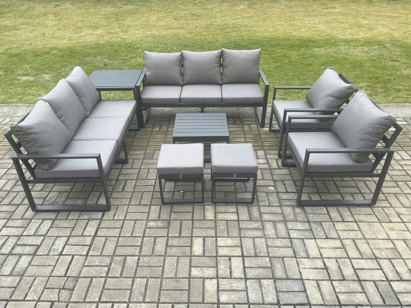 This 8-piece deluxe aluminium outdoor sofa set is designed to bring a refined, coordinated look to your patio or garden. With a dark grey powder-coated finish and matching dark grey fabric, it creates a smart setting for relaxed everyday lounging or entertaining.