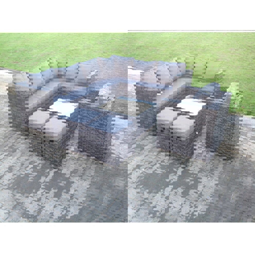 This classic L-shaped corner sofa set is designed for outdoor lounging and socialising, with seating for up to 9 people. Finished in dark grey mixed rattan with matching dark grey fabric, it brings a coordinated look to patios and garden spaces, while the soft back cushions and 8cm-thick seat cushions add comfort for longer gatherings.