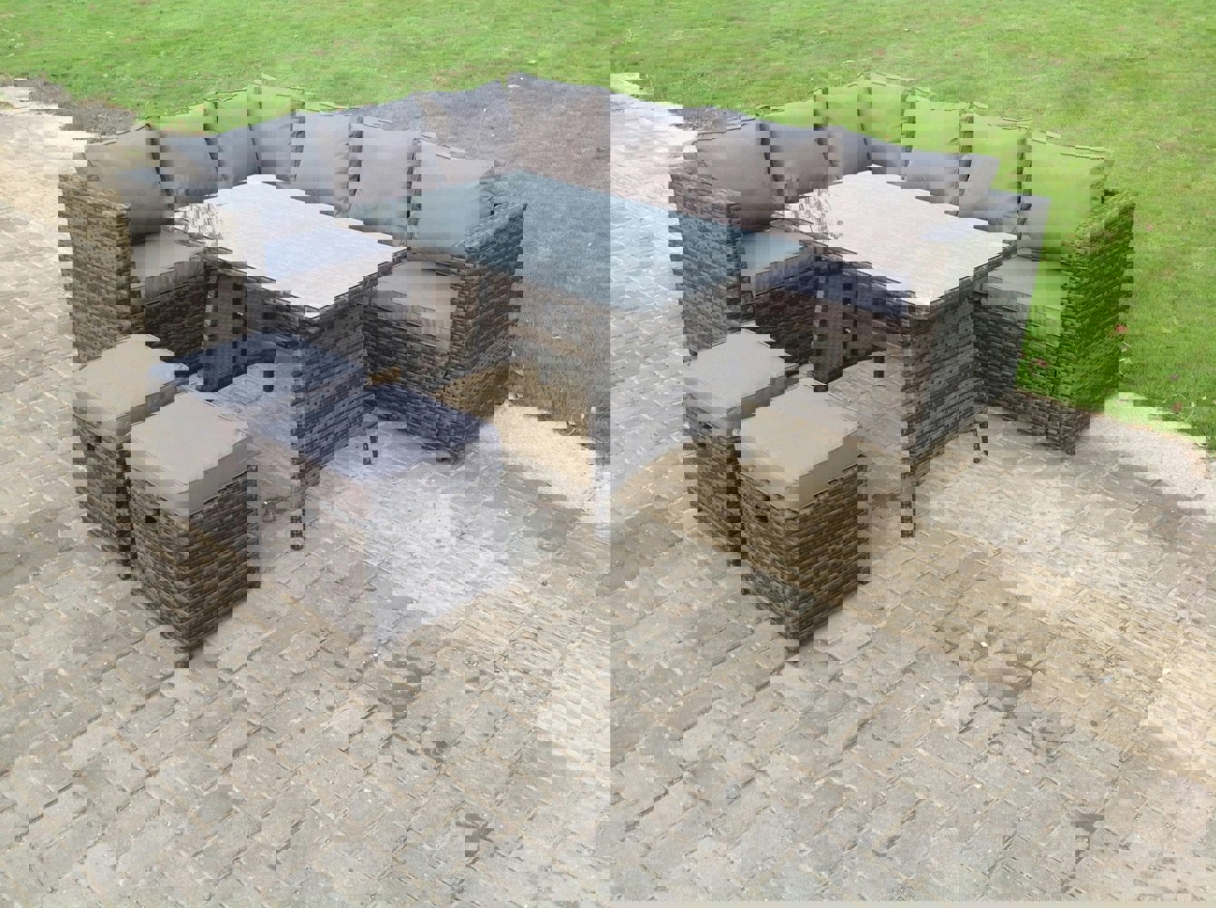 Designed for relaxed dining and sociable lounging outdoors, this deluxe rattan corner sofa dining set makes a refined addition to a patio or garden. It combines a corner seating arrangement with a dining table and footstools, creating a versatile setup for everyday use and entertaining.
