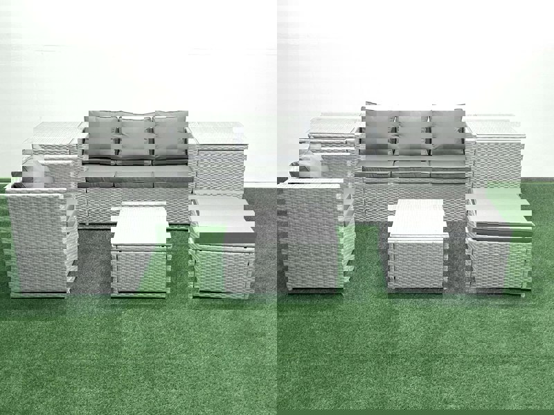 Finished in light grey mixed rattan with dark grey fabric, the set combines practical everyday comfort with thoughtful details, including removable cushion covers for easier cleaning and a tempered glass tabletop designed to stay securely in place.
