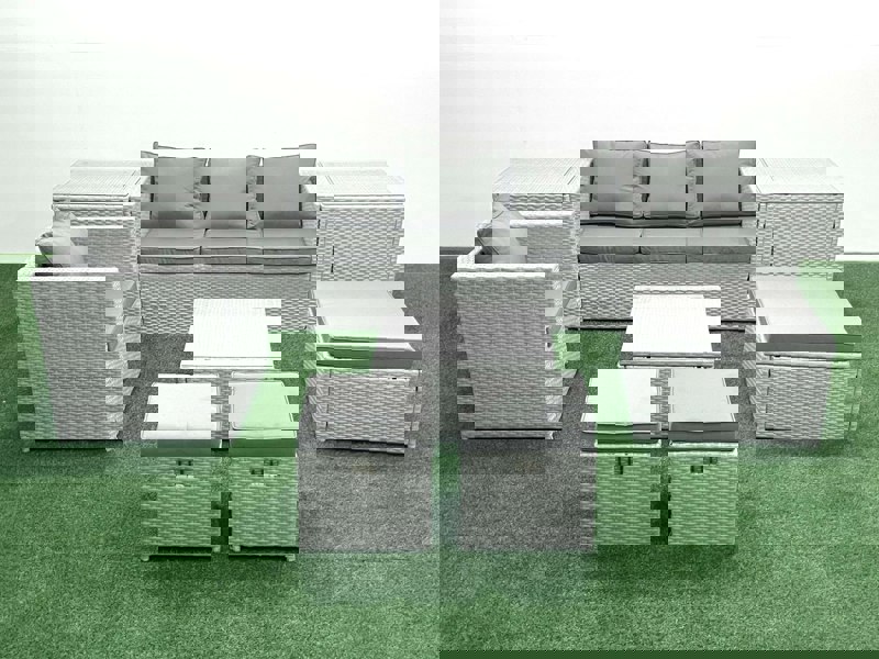 Finished in light grey mixed rattan with dark grey fabric, the set includes cushioned seating for comfort and practical tables for everyday use. Items are supplied flat-packed for self-assembly.