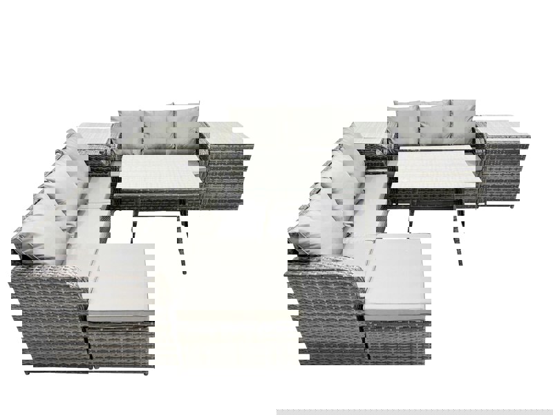 Crafted with PE rattan and supported by galvanised steel tube frames with a powder coating to help prevent rust, the set is made for everyday use. Comfort is enhanced by an ergonomic high back and a reclining design, while the dining table features 5mm thick transparent tempered glass with suckers to help prevent sliding.