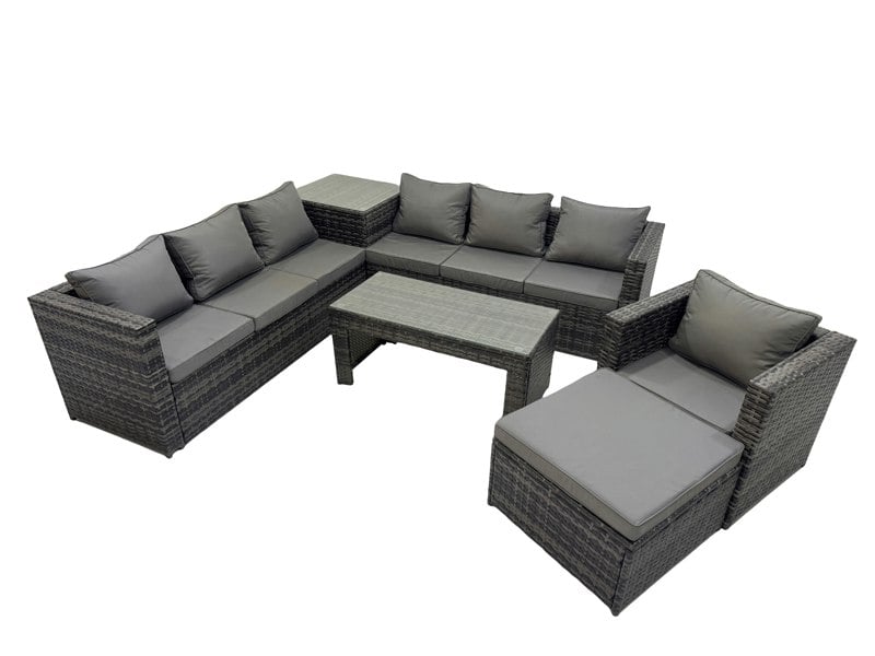 This classic corner sofa set is designed for outdoor living, with seating for up to 8 people. Finished in dark grey mixed PE rattan, it comes with soft back cushions and 8cm thick seat cushions to keep your patio setup comfortable for everyday lounging and relaxed entertaining.
