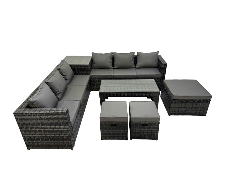 Designed for outdoor living, this classic corner sofa set seats up to 9 people, creating a generous space for relaxed gatherings on the patio or in the garden. Soft back cushions and an 8cm-thick seat cushion are paired with a pillow-style back cushion to enhance comfort.