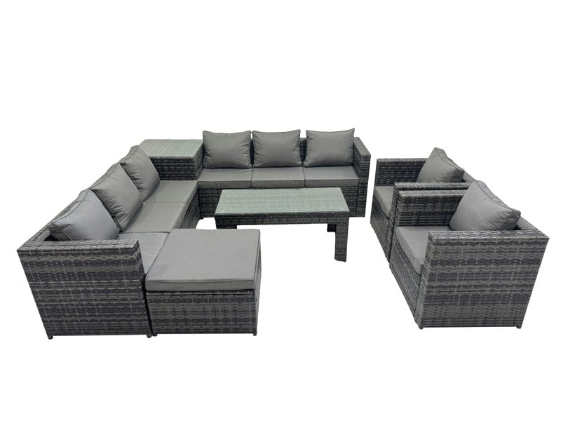 Designed for relaxed outdoor living, this classic corner sofa set seats up to 9 people and pairs a comfortable, soft cushion back with a practical layout for entertaining. Finished in dark grey mixed PE rattan, it is made to suit British weather and brings a clean, contemporary look to patios and garden spaces.