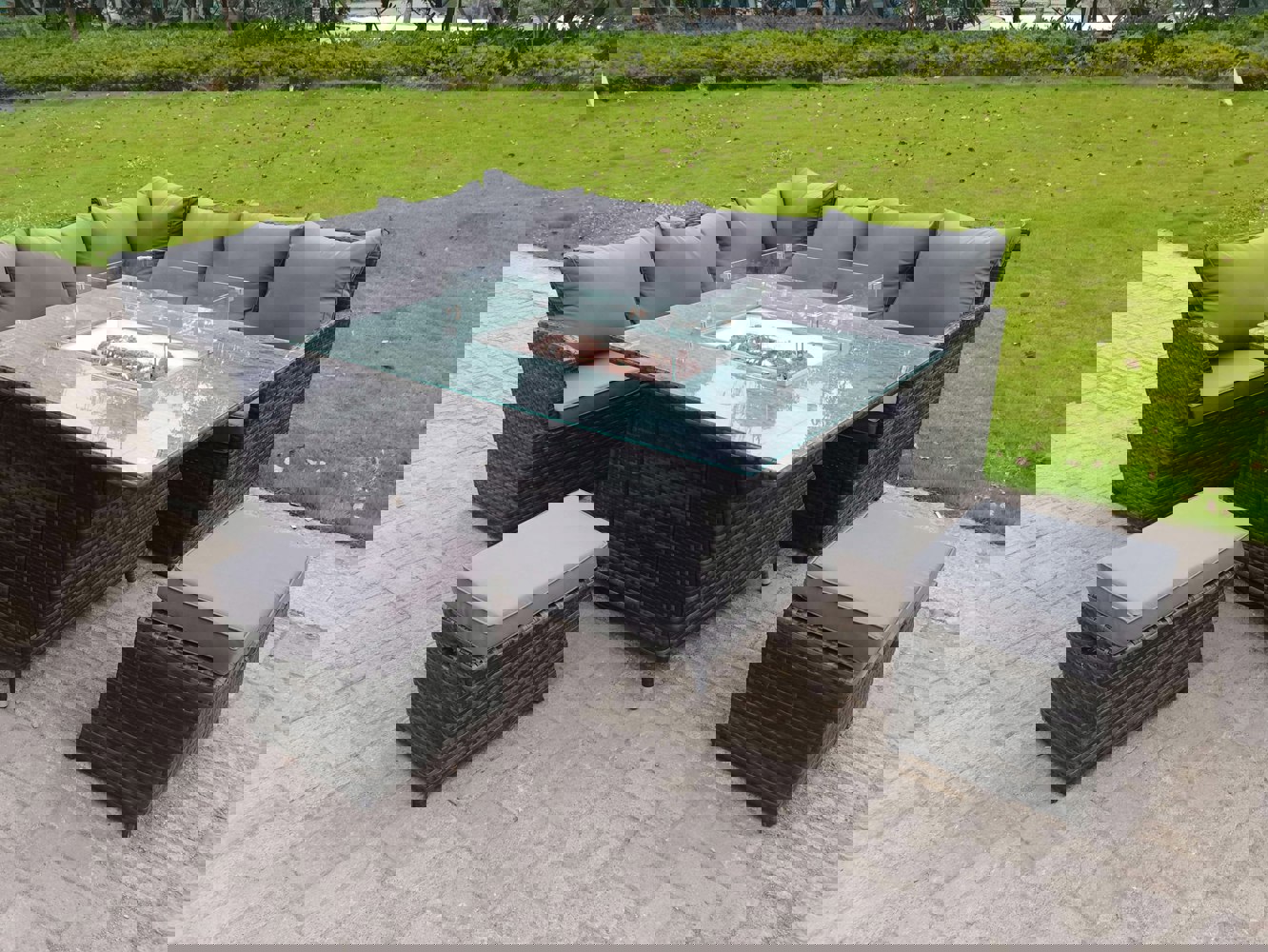 Create a refined outdoor seating and dining space with this high-back rattan garden furniture set, complete with a gas fire pit dining table. Designed for relaxed entertaining at home, it pairs generous seating with a central table that brings warmth and ambience to your patio or garden.