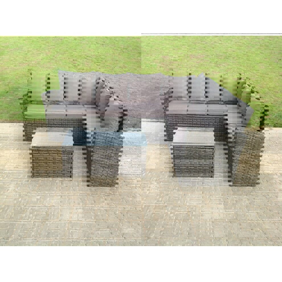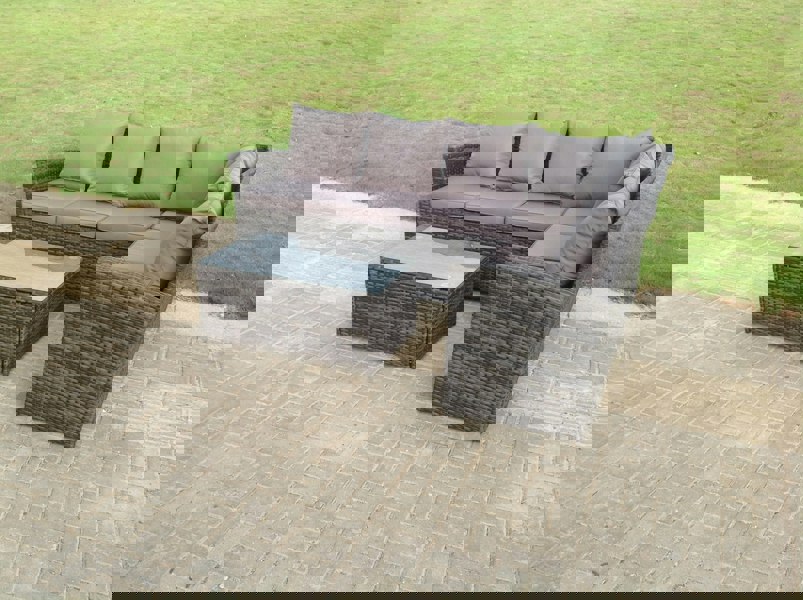 The Fimous High Back Rattan Corner Sofa Set is a classic outdoor corner arrangement designed to accommodate 6 peoples, complete with an oblong coffee table for relaxed garden lounging. Finished in dark grey mixed PE rattan, it is made to suit everyday outdoor living and is paired with soft back cushions and an 8 cm thick seat cushion for added comfort.