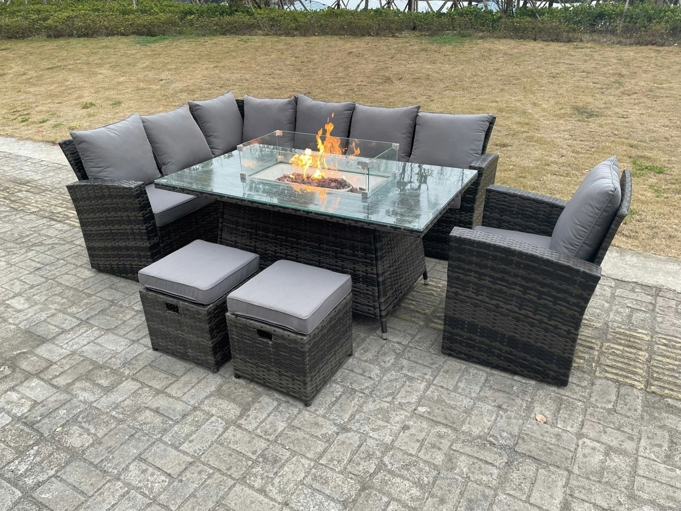 Create a refined outdoor seating area with this high back rattan garden furniture set, complete with a gas fire pit dining table for relaxed evenings outdoors. Designed for socialising and everyday comfort, the set combines supportive seating with practical details that suit patios, terraces and garden spaces.