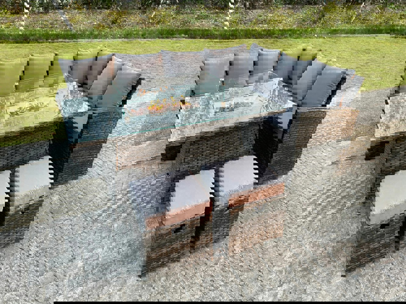 With a dark grey mixed rattan finish and matching dark grey fabric cushions, the set is made for everyday outdoor use. The furniture arrives flat packed for straightforward assembly, while the included footstools come fully assembled for added convenience.