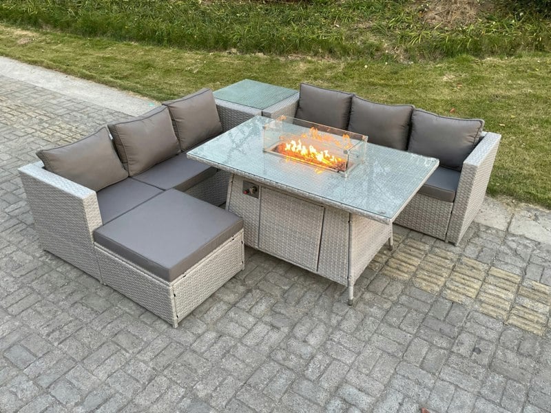 Create a refined outdoor lounge setting with this light grey mixed rattan garden furniture set, complete with a fire pit table, side table and footstool. Designed for relaxed entertaining at home, it pairs generous seating with a central fire pit table for comfortable gatherings in the garden or on the patio.