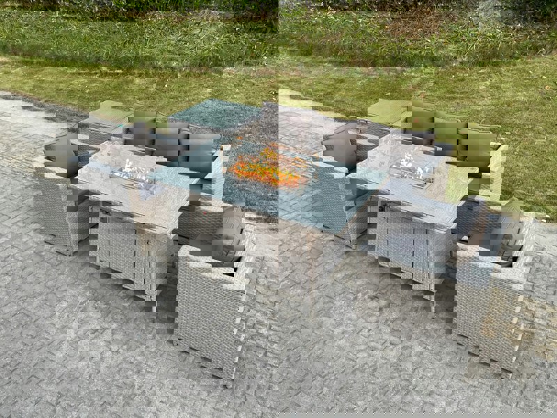 Create a refined outdoor seating and dining space with this light grey mixed rattan garden furniture set, complete with a gas fire pit table for relaxed entertaining. Designed to suit patios and gardens, the set combines a three seater sofa, two chairs and a side table, with dark grey fabric for a coordinated finish.