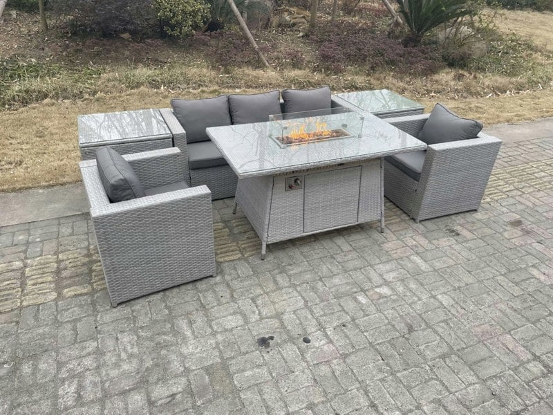 Designed for relaxed outdoor entertaining, this rattan garden furniture set pairs generous seating with a coordinating gas fire pit table for a refined lounge layout. With a three seater sofa, 2 chairs and 2 side tables, it creates a comfortable space for gathering, dining or unwinding in the garden.