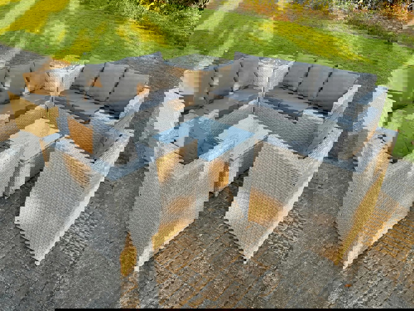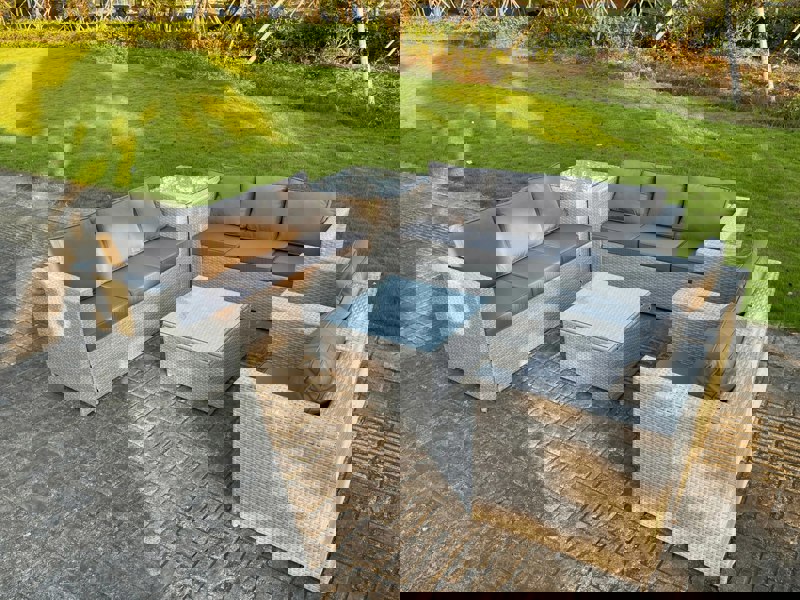 Finished in light grey mixed rattan with dark grey fabric, the set is low maintenance and easy to reposition around your space. It arrives flat packed for straightforward assembly, making it simple to set up for everyday lounging and entertaining.
