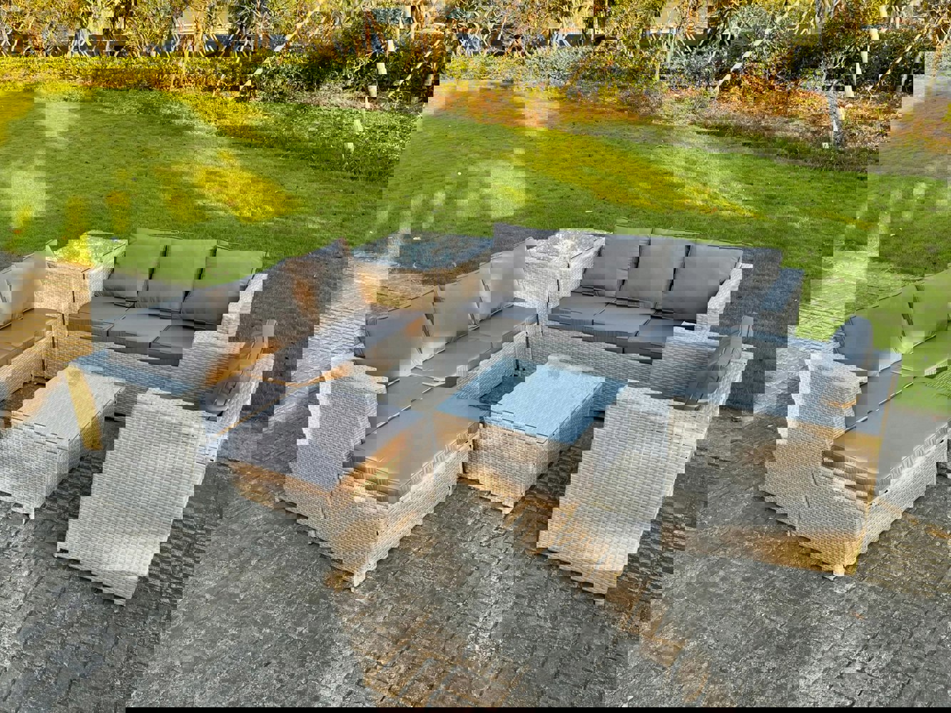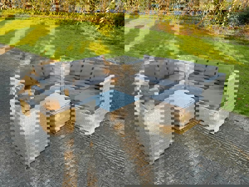 With a coordinated mix of light grey rattan and dark grey fabric, the set includes sofas, an armchair, coffee tables and a large footstool for flexible lounging and entertaining. It arrives flat packed and requires self-assembly.