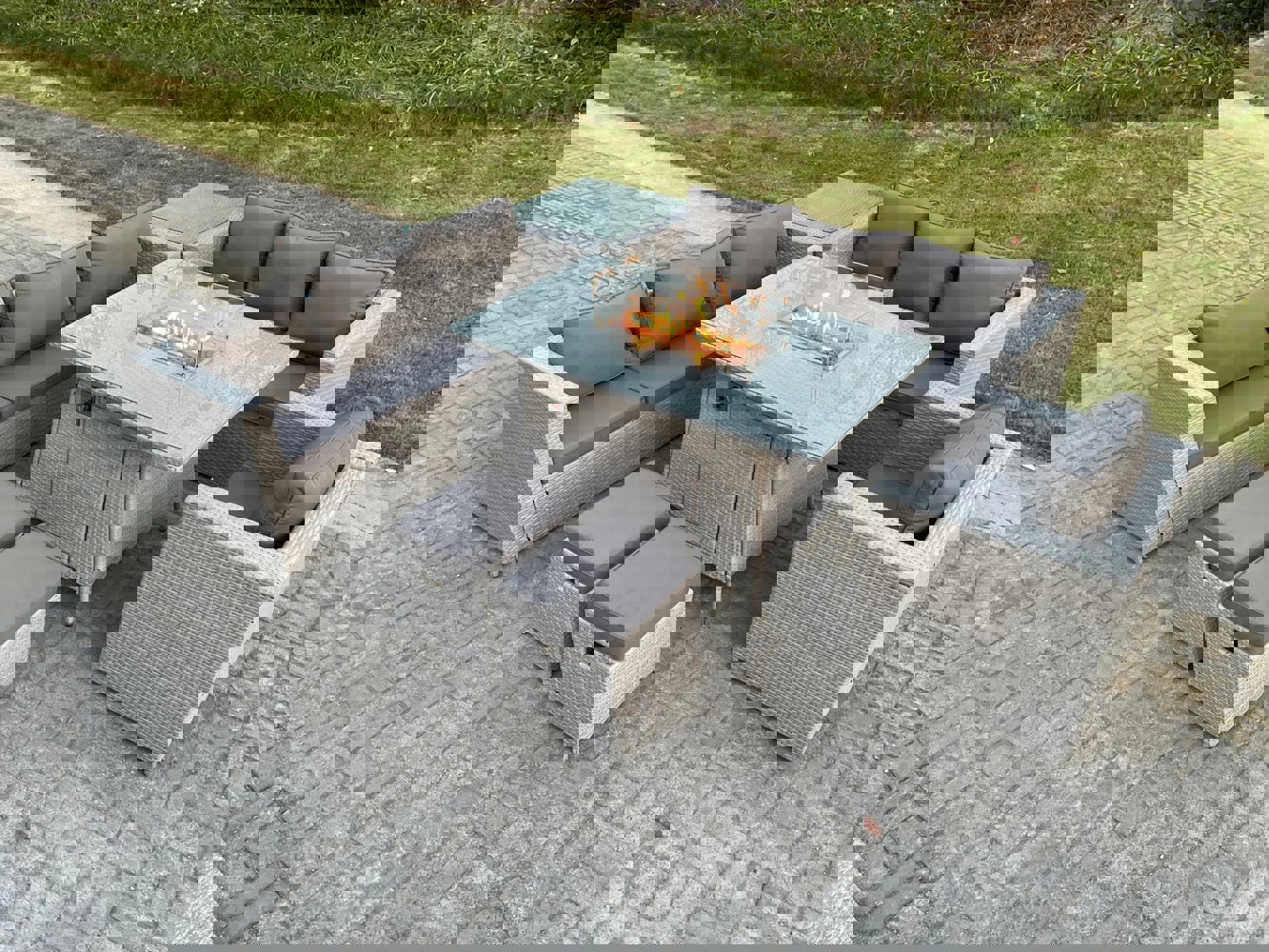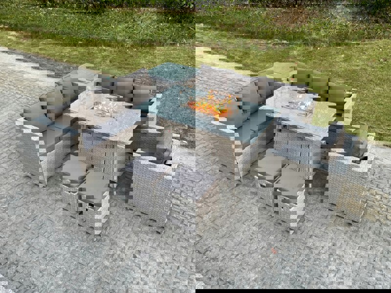 The Fimous Light Grey Rattan Fire Pit Garden Furniture Dining Table Set is designed to bring relaxed outdoor dining and lounge seating together, with a dedicated fire pit table for gas heater use. Finished in light grey mixed rattan with dark grey fabric, it creates a coordinated look for patios and garden spaces.
