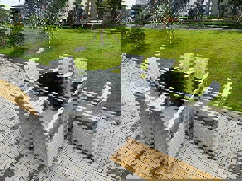 Create an inviting outdoor dining space with this light grey rattan garden furniture set, designed for relaxed meals and easy entertaining. With a rectangular dining table topped in black tempered glass and six matching chairs, it offers a cohesive look for patios, gardens or balconies.