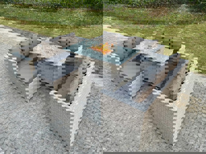 Create a refined outdoor setting with this light grey U-shape lounge sofa dining set, complete with a gas fire pit table and a matching footstool. Designed for relaxed entertaining, it combines generous seating with a practical table centrepiece for gathering outdoors.
