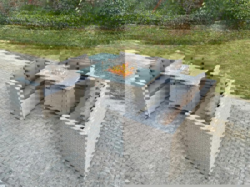Create a refined outdoor setting with this light grey U shape lounge sofa dining set, complete with a gas heater fire pit dining table and an extra side coffee/tea table. Designed for relaxed entertaining, it offers generous seating and a coordinated look for patios and garden spaces.