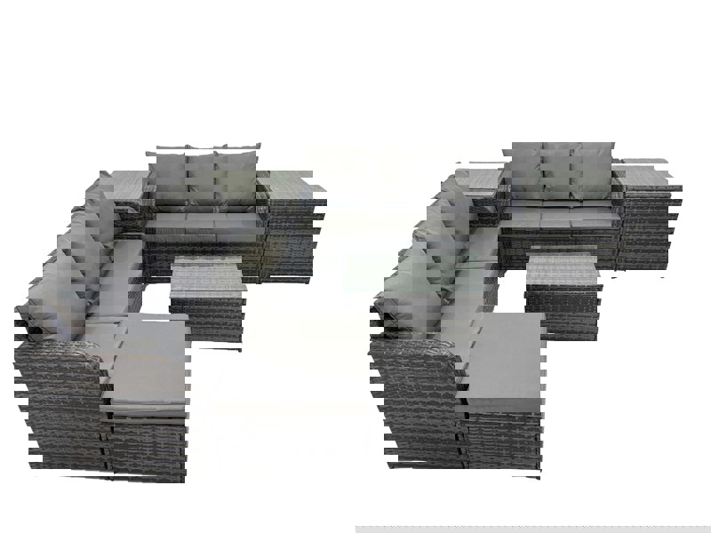 The set is supplied with cushions shaped to suit the sofa and chairs for added comfort, while the tempered glass tabletop is designed to sit securely in place. Delivered flat packed for easy assembly, it is finished in dark grey mixed rattan with matching dark grey fabric.