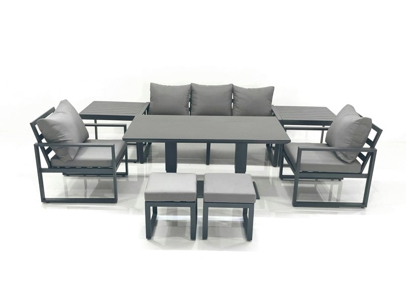 Designed for relaxed outdoor living, this aluminium adjustable rising sofa dining set brings together lounge-style comfort and flexible dining height for your patio or garden. Finished in dark grey powder coating with matching dark grey fabric, it offers a coordinated look that suits everyday entertaining and laid-back evenings alike.