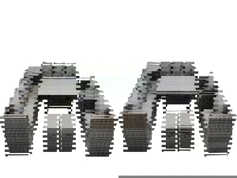 Designed for patio or garden use, this deluxe PE rattan furniture set brings a coordinated seating and dining arrangement to your outdoor space. Made from high quality PE rattan with a durable galvanised steel construction, it is built for sturdiness and long-lasting use, and can be kept outdoors all year round.