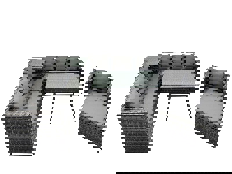 Designed for patio or garden living, this deluxe PE rattan sofa set brings a coordinated seating and dining arrangement to your outdoor space. Made from high quality PE rattan with a durable galvanised steel construction, it is built for sturdiness and long-lasting use, and can be kept outdoors all year round.