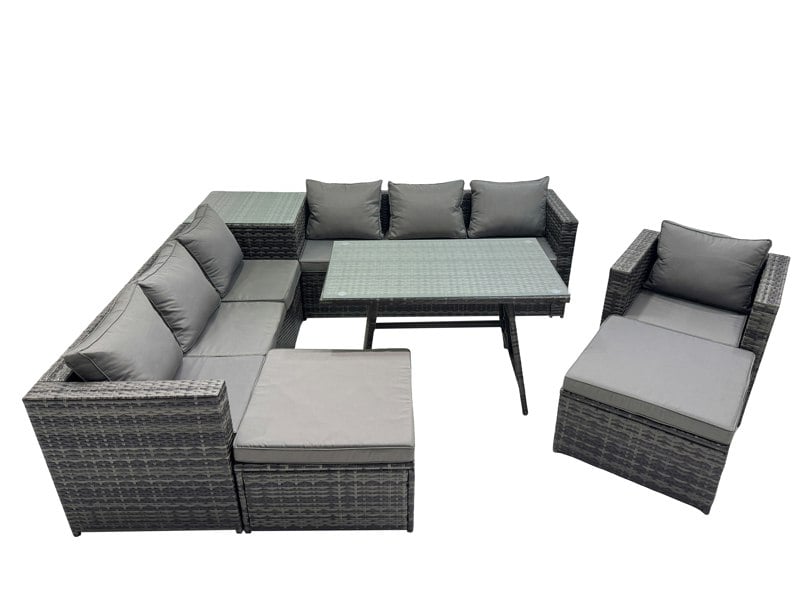 Finished in dark grey mixed rattan with dark grey fabric, the set is supplied flat packed for self-assembly. Practical details such as removable cushion covers and a tempered glass tabletop help keep everyday use simple, while the generous seat and back cushions add comfort for lounging and dining.