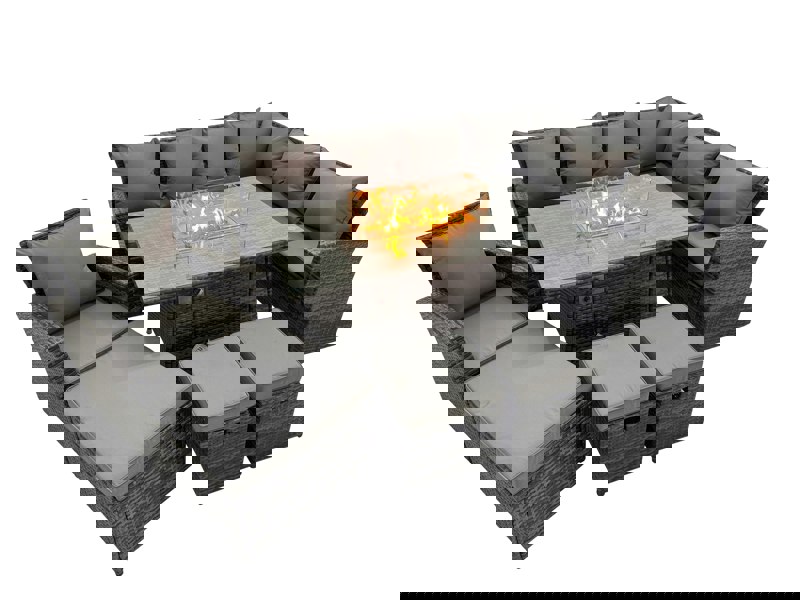 This outdoor furniture garden dining set brings together a corner sofa arrangement, a chair and a gas fire pit dining table for relaxed entertaining outdoors. Finished in dark grey mixed rattan with dark grey fabric, it is designed to create a coordinated look across your patio or garden.
