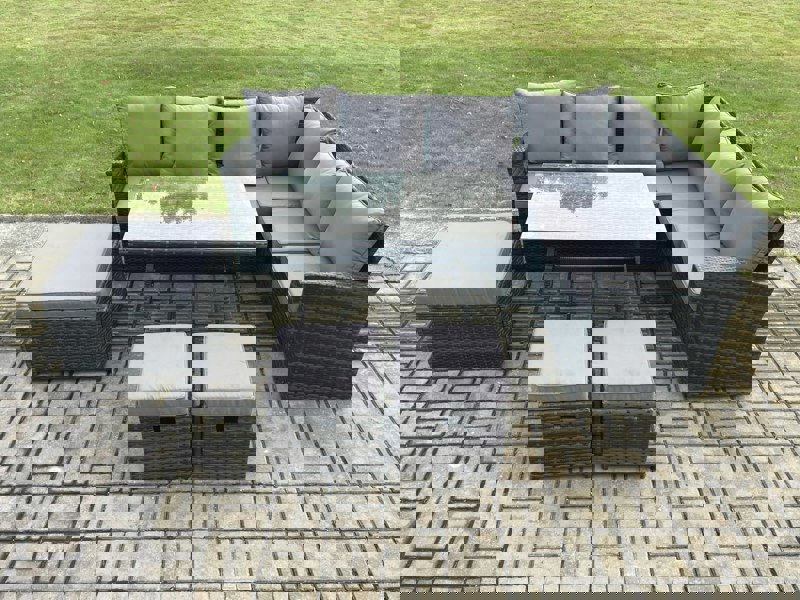Designed for relaxed outdoor living, this deluxe rattan sofa set makes an inviting centrepiece for your patio or garden. With a combination of sofa seating, footstools and an oblong dining table, it creates a comfortable space for spending time with family and friends.