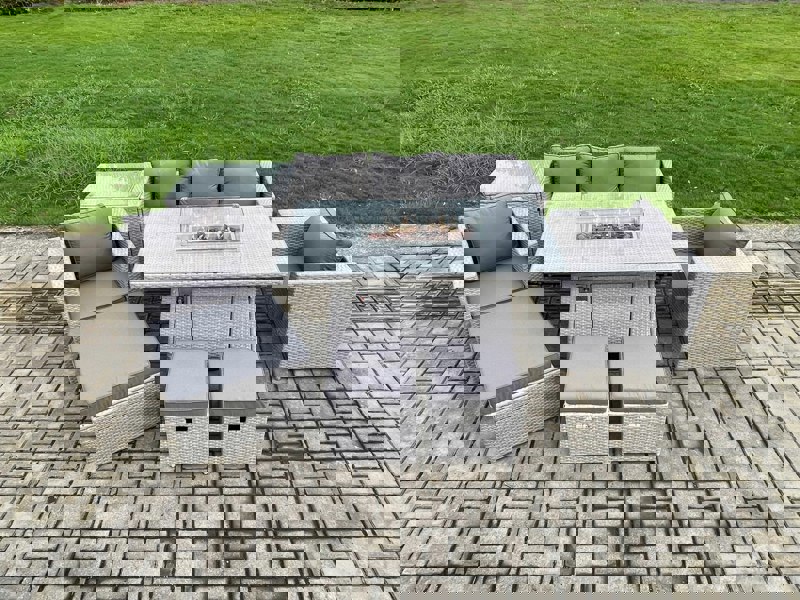 Create a refined outdoor setting with this rattan garden dining set, complete with a gas fire pit dining table for relaxed evenings and sociable gatherings. Finished in light grey mixed rattan with dark grey fabric, it brings coordinated style across seating and tables.