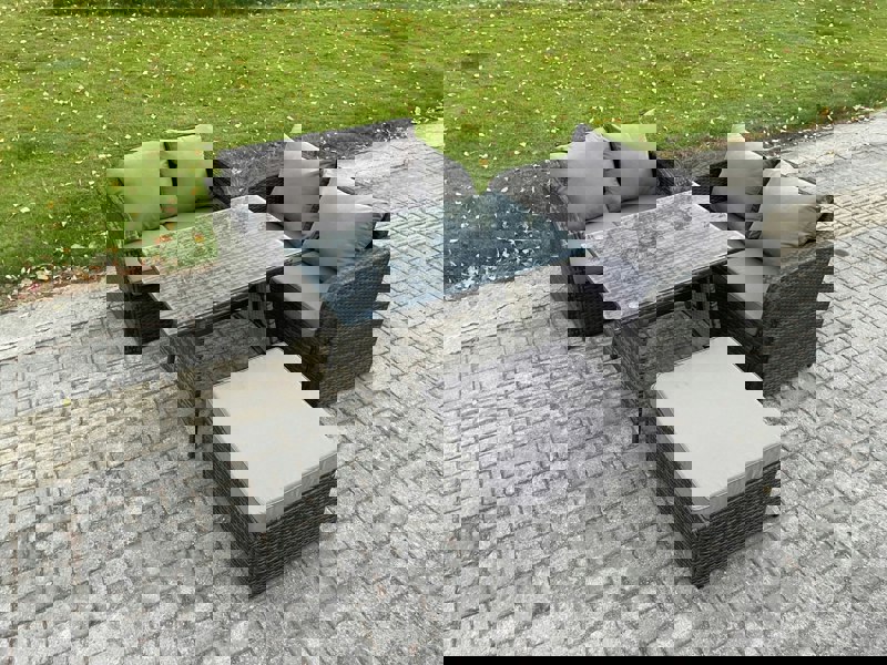 Finished in dark grey mixed rattan with dark grey fabric, the set arrives flat packed and is described as easy to assemble. Comfort is enhanced with an 8cm thick seat cushion and a soft pillow back cushion, while the rectangular dining table is topped with 5mm transparent tempered glass secured with suckers to help prevent sliding.
