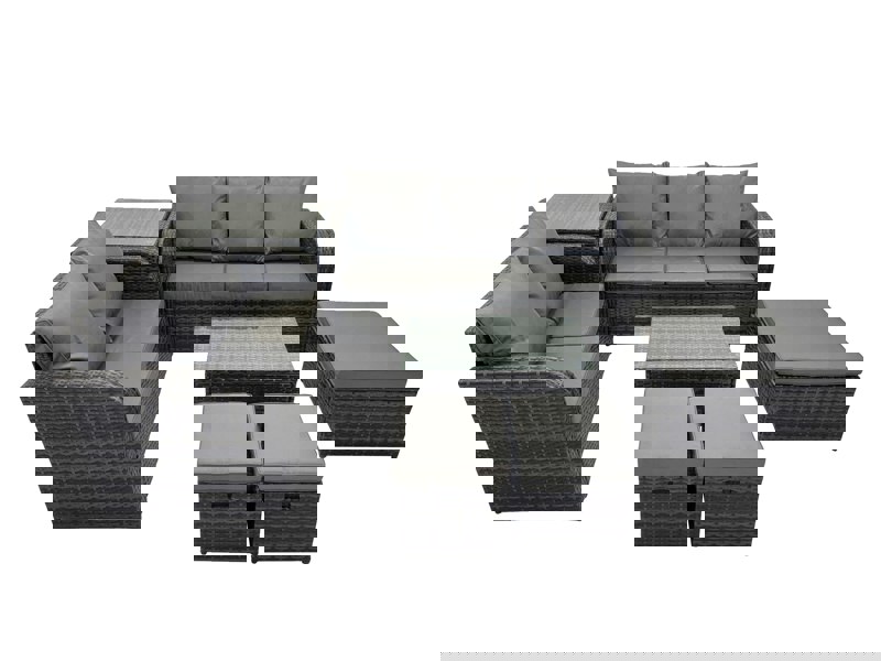 This modern deluxe rattan garden furniture set is designed for relaxed outdoor living across a range of settings, including the garden, patio or conservatory. With fitted cushions shaped to the sofa and chairs, it offers a comfortable place to gather, lounge and entertain.