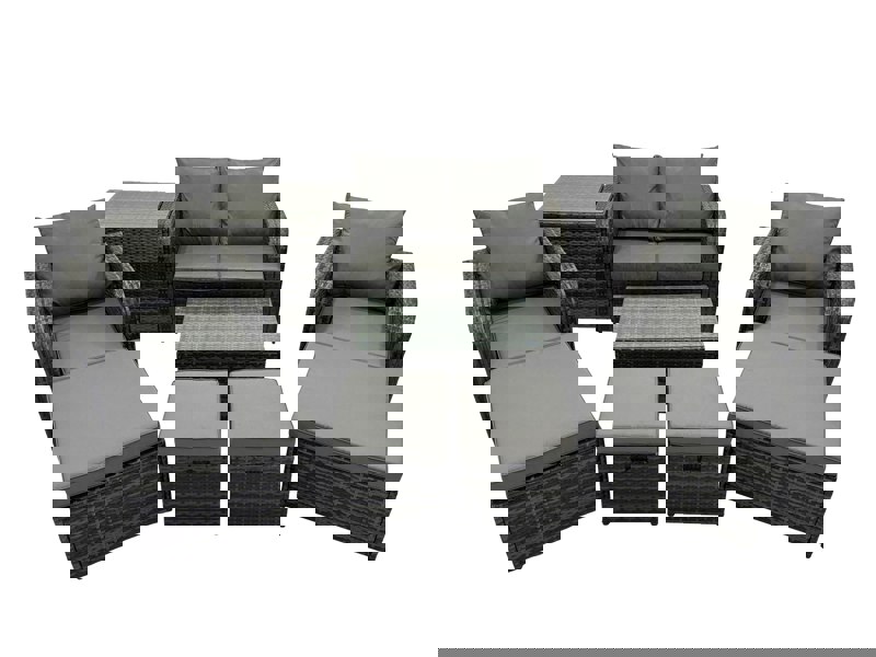 Made with high quality PE rattan and a galvanised steel construction, the set is designed for sturdiness and long-lasting use. Two reclining chairs allow you to adjust the chair back inclination from 90° to 130° via a button, while the high-back, reclining design supports comfortable relaxation.