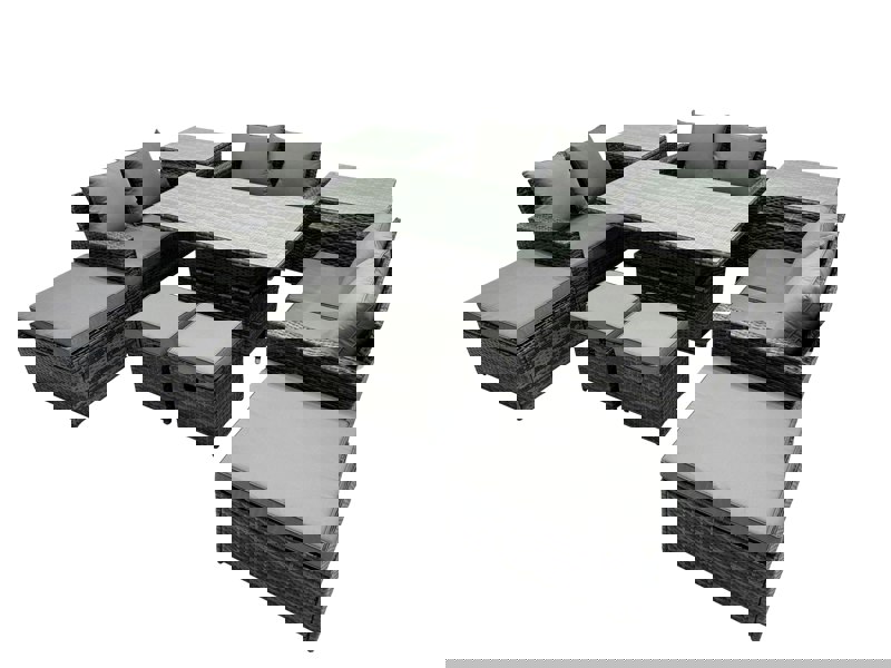 Finished in dark grey mixed rattan with dark grey fabric cushions, the set includes a rising dining table that can be used as either a coffee table or a dining table, helping you adapt your layout for everyday lounging or entertaining.