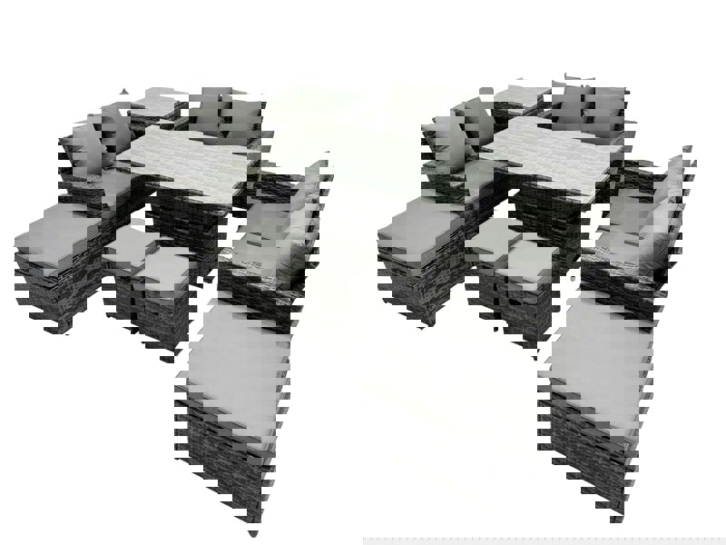 Finished in dark grey mixed rattan with dark grey fabric, the set includes a rising dining table that can be used as either a coffee table or dining table, alongside coordinating seating, footstools and a side table. Seat cushions are 8cm thick, with soft pillow back cushions for added comfort.