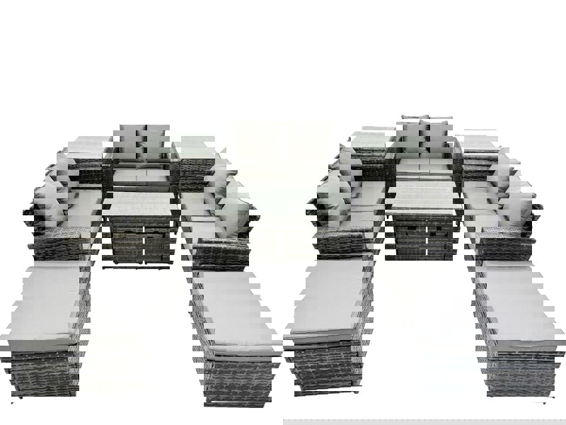 Finished in dark grey mixed rattan with dark grey fabric, the set includes an oblong coffee table and a choice of footstools to create flexible seating and serving space. Tempered glass table tops are secured with suckers to help prevent sliding, while removable cushion covers support easy maintenance.