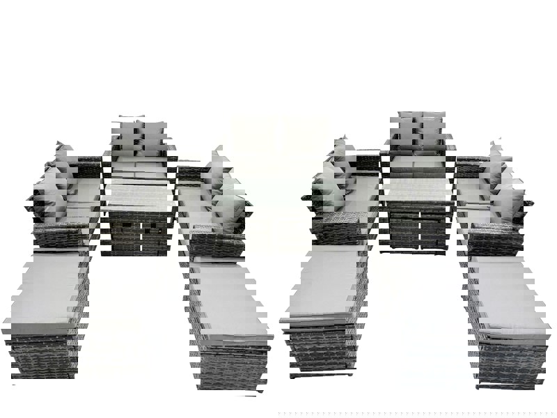 Finished in dark grey mixed rattan with dark grey fabric, the set includes an oblong coffee table and a combination of sofas and footstools for flexible lounging and entertaining. Flat packed for easy assembly, it is designed for low-maintenance everyday living outdoors.