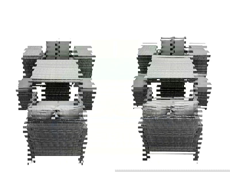Built with high quality PE rattan and a durable galvanised steel construction, the set is made for sturdiness and long-lasting use. The rising dining table adjusts between 68cm and 48cm in height, allowing you to switch between coffee-table and dining-table use with ease.