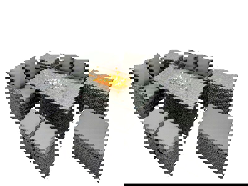Designed for relaxed outdoor dining and entertaining, this rattan garden furniture set brings together generous seating with a fire pit dining table for a refined patio or garden layout. Made with high quality PE rattan and a durable galvanised steel construction, it is built for sturdiness and long-lasting use outdoors all year round.