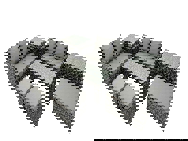 Finished in dark grey mixed rattan with dark grey fabric, the set includes an oblong coffee table and coordinating side tables, alongside sofas and footstools for flexible lounging and entertaining. Flat-packed for easy assembly, it also features removable cushion covers for low-maintenance everyday use.