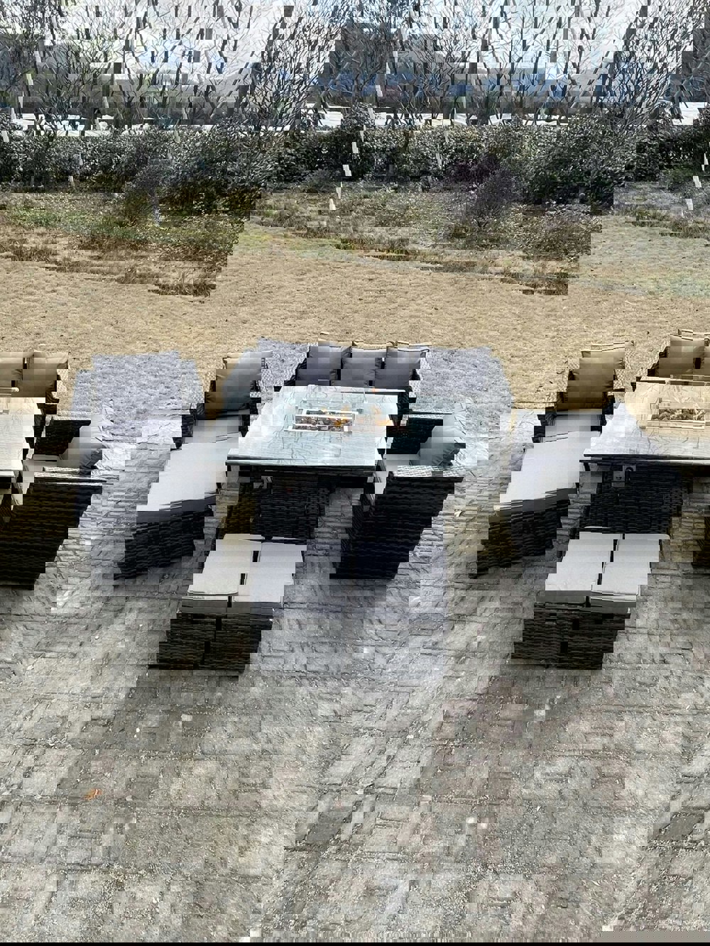 Bring relaxed outdoor dining to your patio or garden with this deluxe rattan sofa dining set, complete with a gas fire pit dining table. Designed for social evenings outdoors, it pairs generous seating with a central fire pit feature for a practical, all-in-one layout.