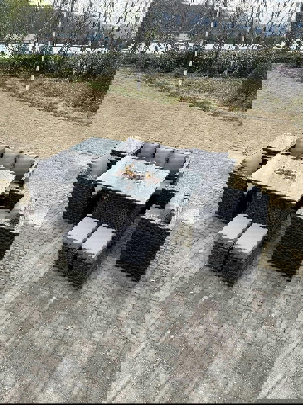 Create a refined outdoor setting with this deluxe rattan sofa dining set, designed for patio and garden use. Combining a gas fire pit dining table with coordinated seating, it offers a practical space for relaxed meals and evening gatherings.
