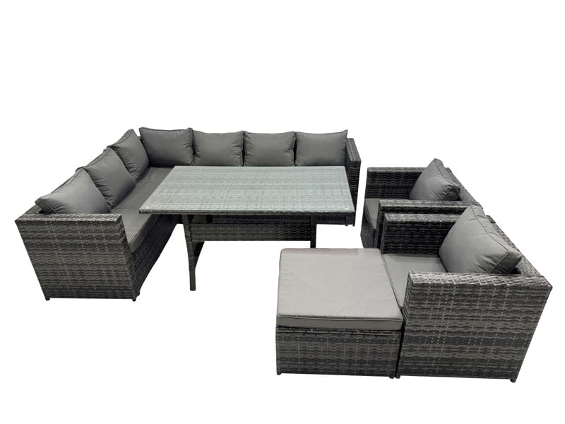 Comfort is built in, with 8 cm thick seat cushions and soft pillow back cushions for supportive lounging and dining. A dining table with 5 mm thick transparent tempered glass is secured with suckers on the surface to help prevent sliding, while the set arrives flat packed and is described as easy to assemble.